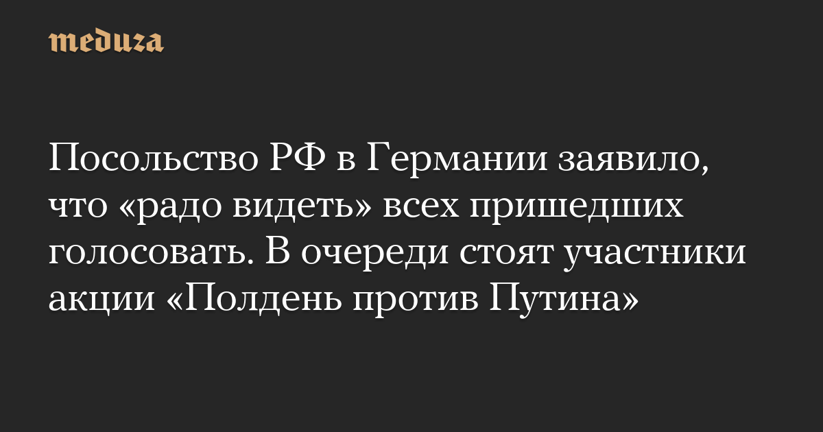 В официальном аккаунте посольства России в Германии заявили, что «рады видеть всех граждан России, готовых отдать свой голос». В очереди к избирательному участку в здании посольства стоят тысячи россиян, пришедших на акцию «Полдень против Путина».