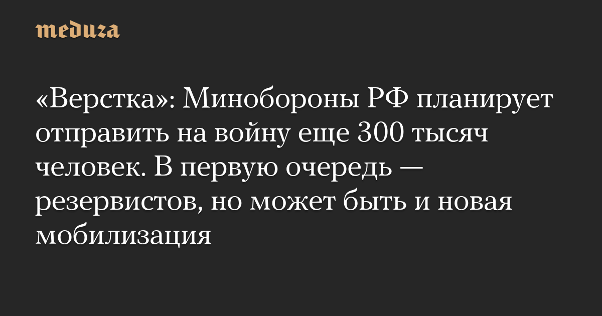 Минобороны РФ планирует в ближайшее время отправить на войну еще 300 тысяч человек. Об этом пишет «Верстка» со ссылкой на четыре источника в администрации президента и региональных правительствах, а также высокопоставленного сотрудника Минобороны.