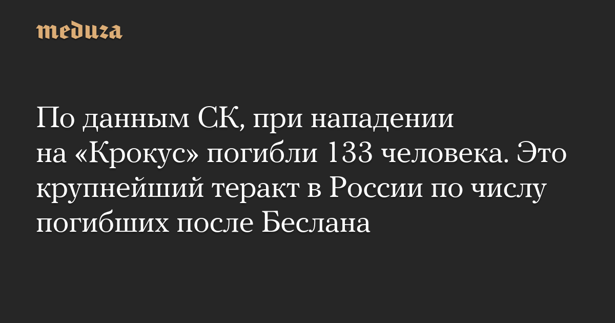 По данным СК, при нападении на «Крокус» погибли 133 человека. Это крупнейший теракт в России по числу погибших после Беслана
