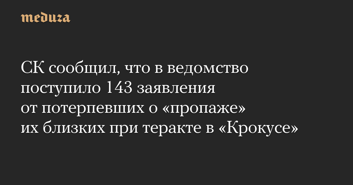 Следственный комитет получил 143 заявления от потерпевших о «пропаже» их родных или близких в результате теракта в «Крокус Сити Холле». Об этом говорится в сообщении СК.