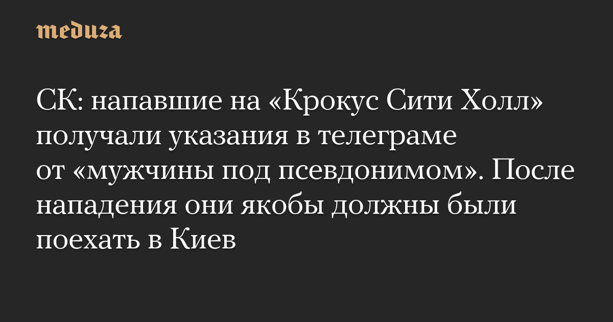 СК: напавшие на «Крокус Сити Холл» получали указания в телеграме от «мужчины под псевдонимом». После нападения они якобы должны были поехать в Киев