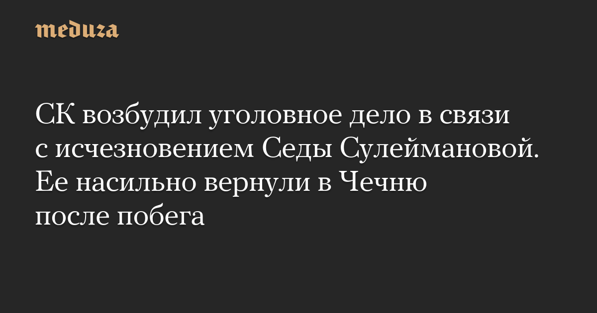 Следственный комитет России возбудил уголовное дело в связи с исчезновением бежавшей и насильно возвращенной в Чечню Седы Сулеймановой, сообщает правозащитный проект «СК SOS».