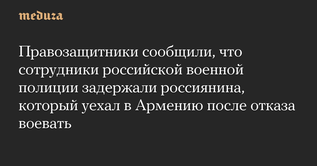 Правозащитники сообщили, что сотрудники российской военной полиции задержали россиянина, который уехал в Армению после отказа воевать