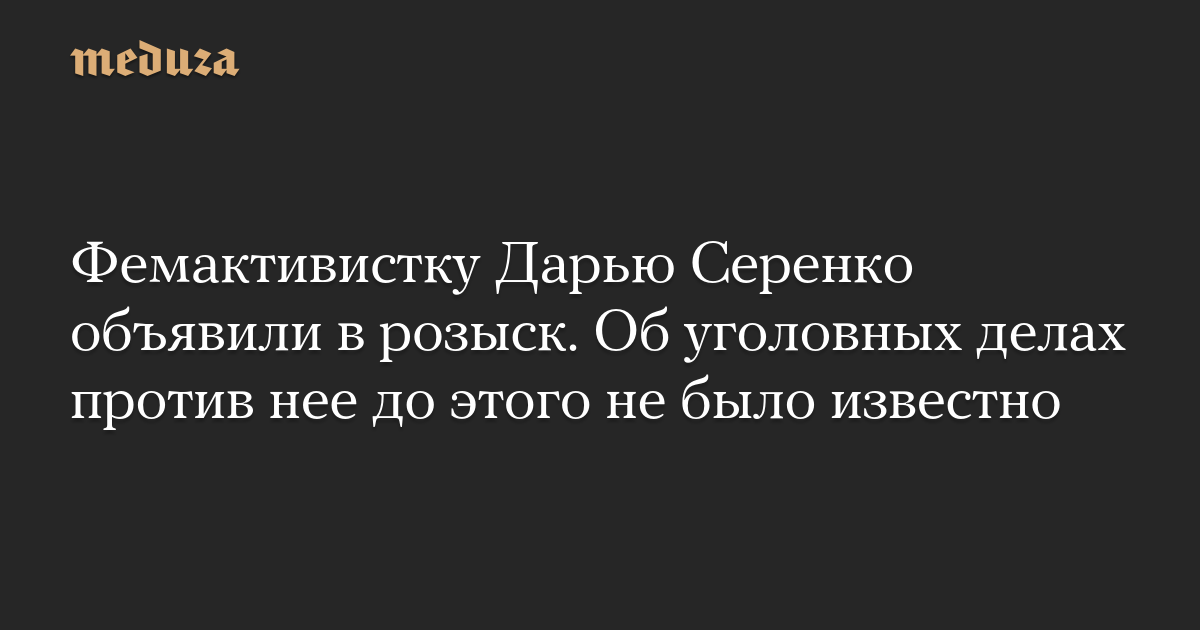 В карточке говорится, что Серенко разыскивается «по статье УК». В чем конкретно ее подозревают, неясно — ранее о возбуждении уголовных дел в отношении активистки не сообщалось.