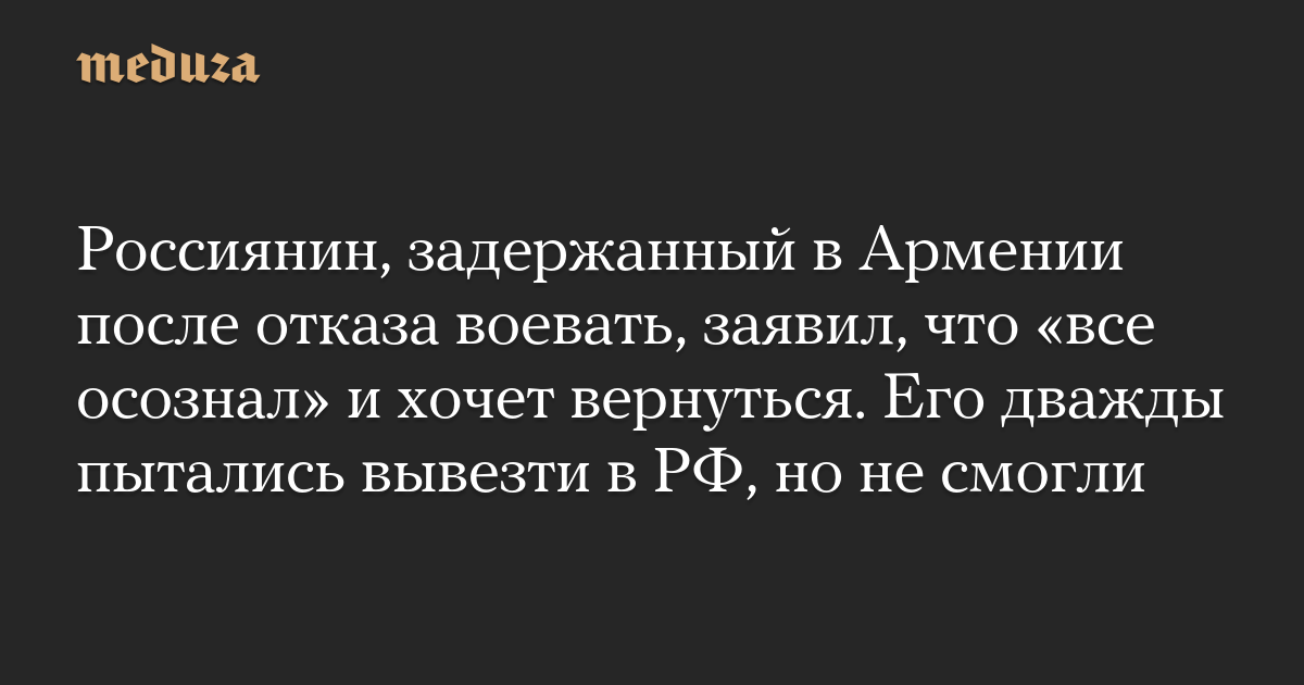 Россиянин, задержанный в Армении после отказа воевать, заявил, что «все осознал» и хочет вернуться. Его дважды пытались вывезти в РФ, но не смогли