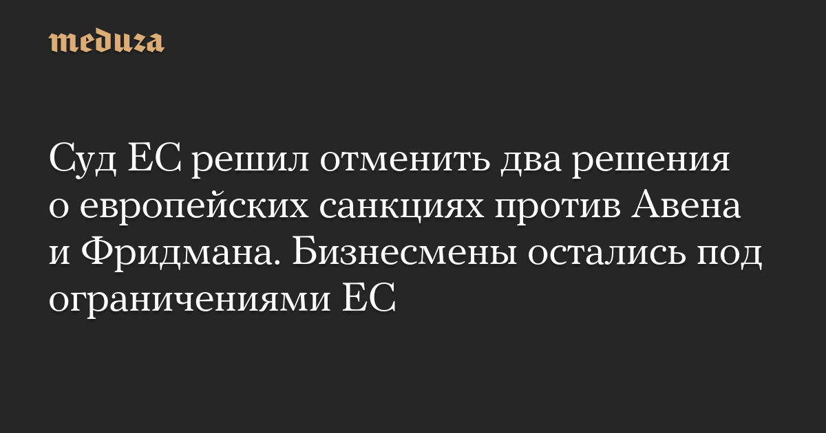 Обновление. Согласно опубликованным текстам решений по искам Авена и Фридмана, бизнесмены остаются в санкционном списке ЕС. Суд постановил аннулировать решение Совета ЕС о введении ограничений против Авена и Фридмана от 28 февраля 2022 года, а также документ о продлении действия санкций от 14 сентября 2022-го. В марте 2023 года Совет ЕС повторно внес бизнесменов в санкционные списки, изменив обоснование ограничений. Сегодняшнее решение суда на этот документ не действует. Подробнее об этом читайте здесь. В связи с этим мы изменили заголовок новости.