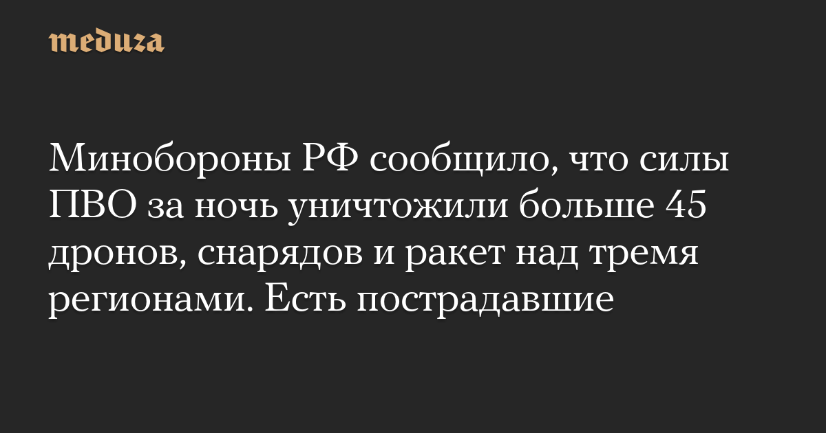 Минобороны РФ сообщило, что силы ПВО за ночь уничтожили больше 45 дронов, снарядов и ракет над тремя регионами. Есть пострадавшие