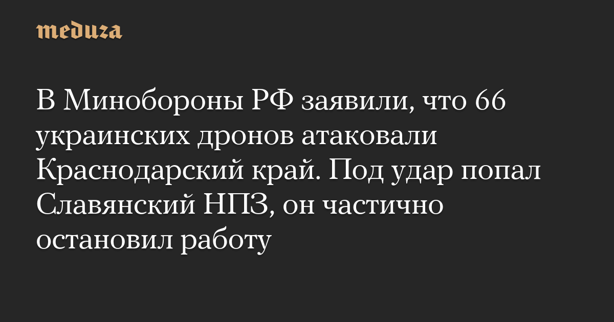 В Минобороны РФ заявили, что 66 украинских дронов атаковали Краснодарский край. Под удар попал Славянский НПЗ, он частично остановил работу