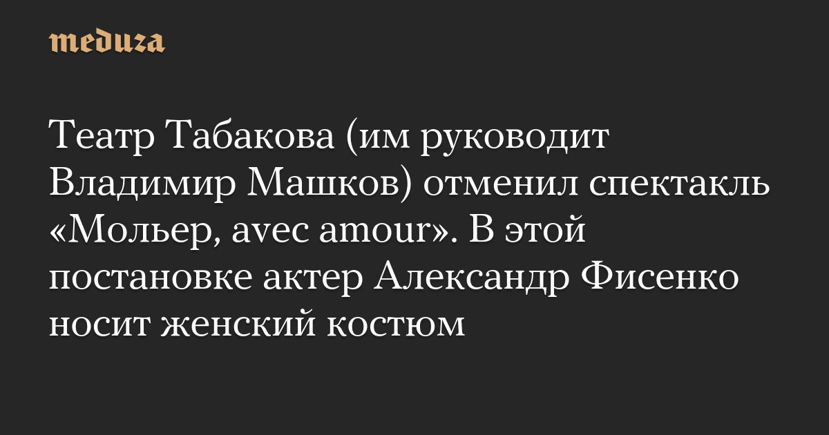 Театр Табакова (им руководит Владимир Машков) отменил спектакль «Мольер, avec amour». В этой постановке актер Александр Фисенко носит женский костюм