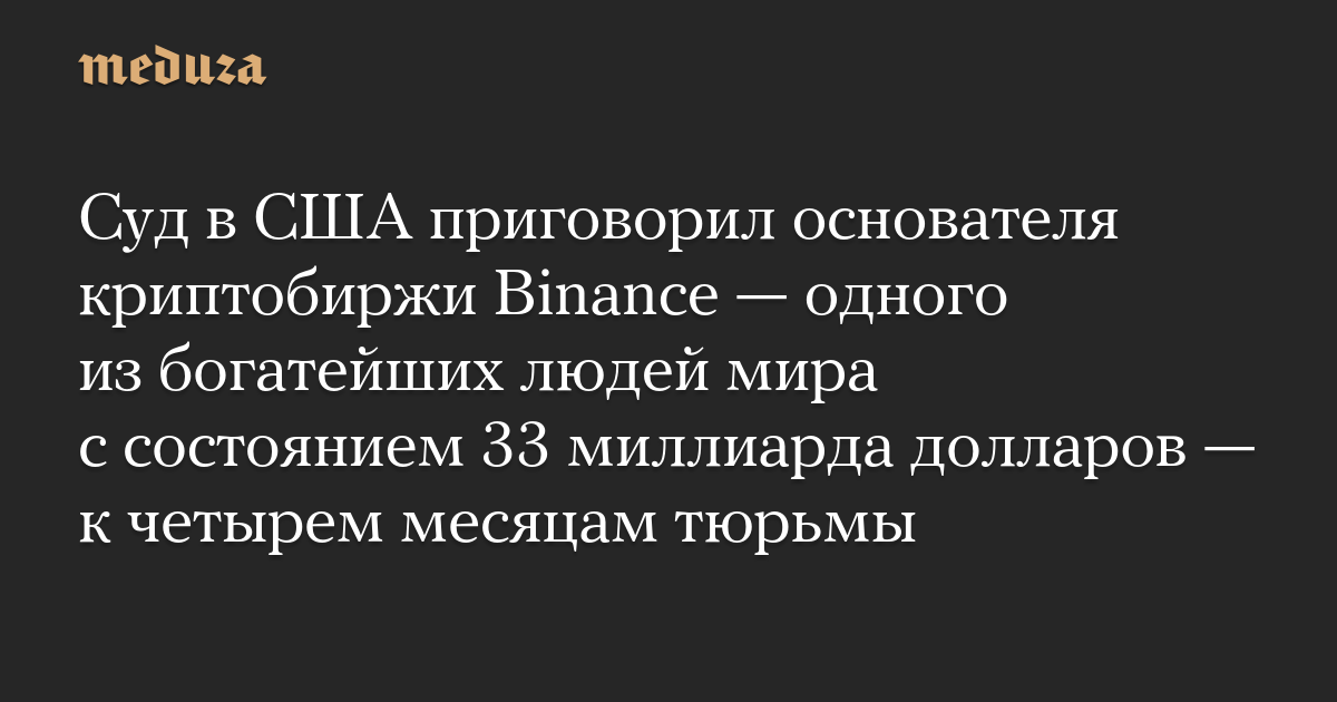 Суд в США приговорил основателя криптобиржи Binance — одного из богатейших людей мира с состоянием 33 миллиарда долларов — к четырем месяцам тюрьмы