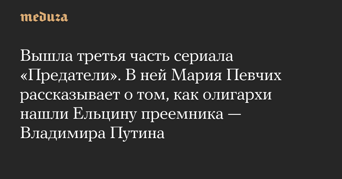 Вышла третья часть сериала «Предатели». В ней Мария Певчих рассказывает о том, как олигархи нашли Ельцину преемника — Владимира Путина