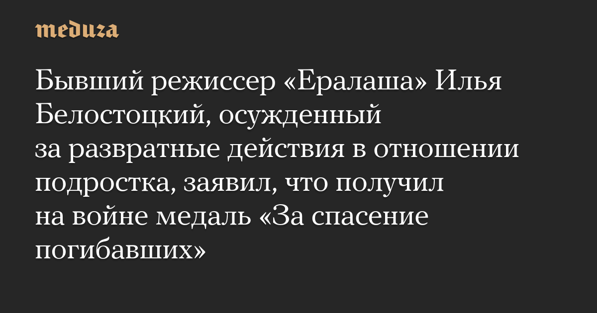 Бывший режиссер киножурнала «Ералаш» Илья Белостоцкий, приговоренный к шести с половиной годам колонии по делу о развратных действиях в отношении подростка и уехавший воевать в Украину, заявил, что получил награду за участие в войне — медаль «За спасение погибавших».