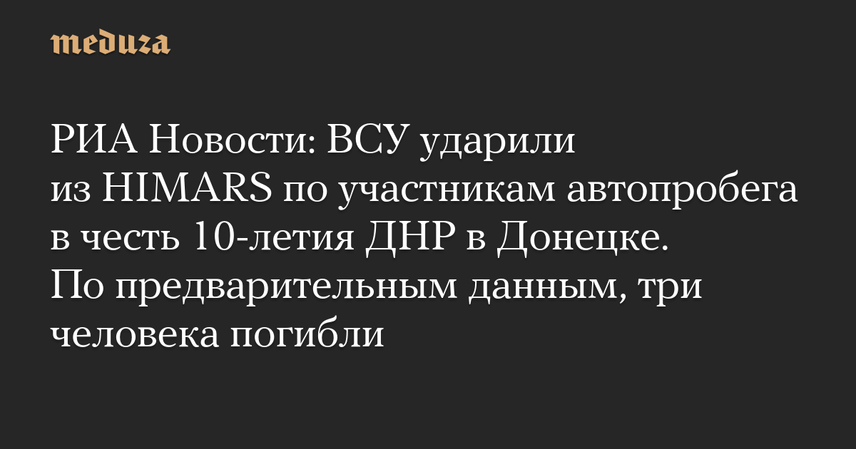 РИА Новости: ВСУ ударили из HIMARS по участникам автопробега в честь 10-летия ДНР в Донецке. По предварительным данным, три человека погибли