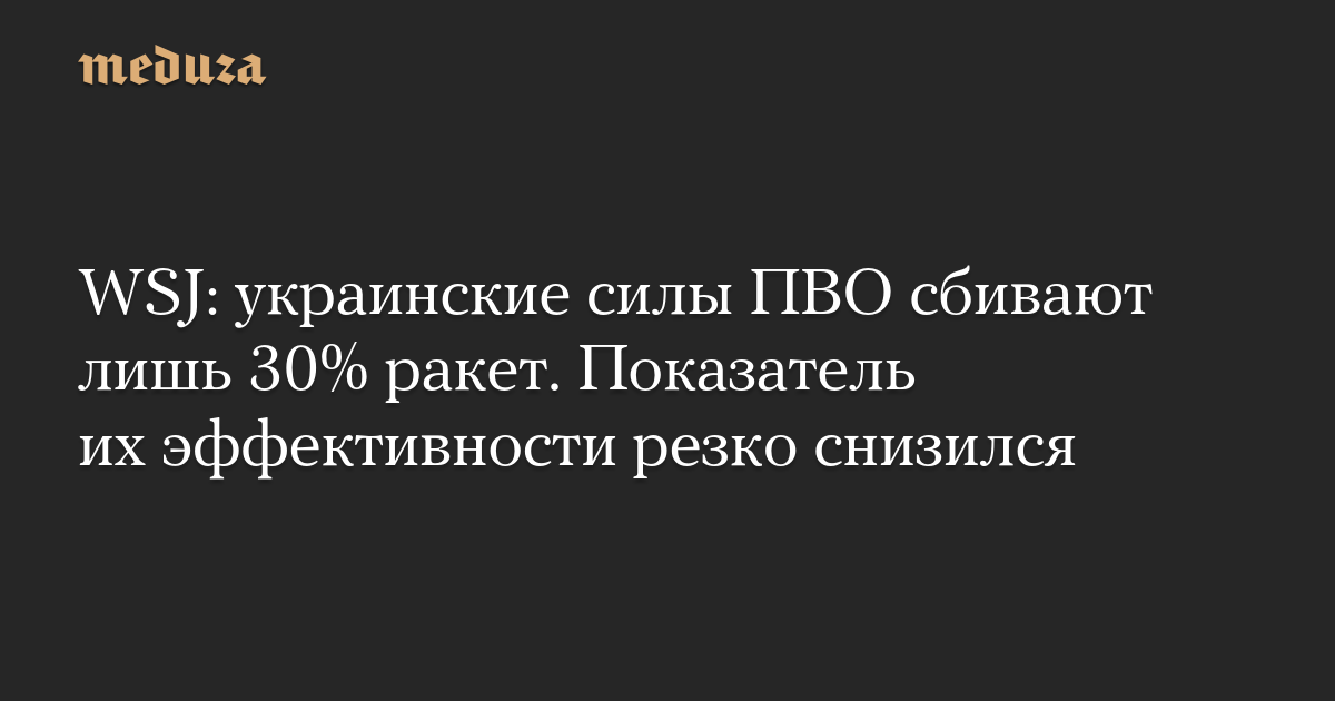 ПВО Украины за последний месяц удавалось сбивать лишь 30% ракет, запущенных российскими войсками, пишет The Wall Street Journal.