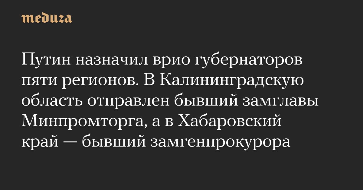 Путин назначил врио губернаторов пяти регионов. В Калининградскую область отправлен бывший замглавы Минпромторга, а в Хабаровский край — бывший замгенпрокурора