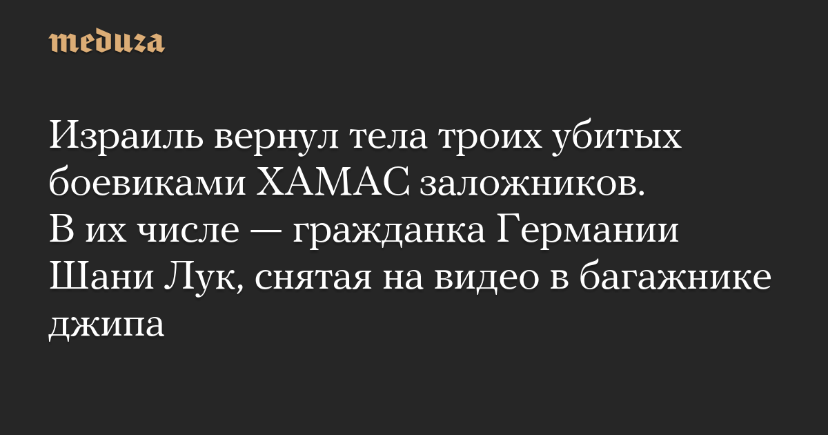 Израиль вернул тела троих убитых боевиками ХАМАС заложников. В их числе — гражданка Германии Шани Лук, снятая на видео в багажнике джипа