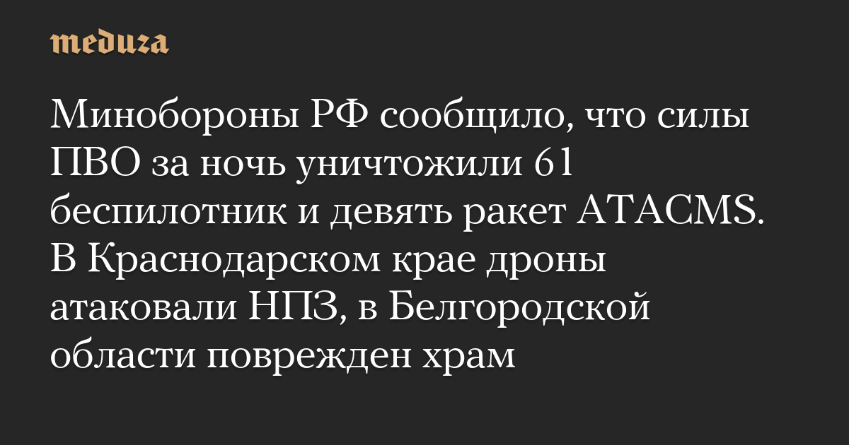 Минобороны РФ сообщило, что силы ПВО за ночь уничтожили 61 беспилотник и девять ракет ATACMS. В Краснодарском крае дроны атаковали НПЗ, в Белгородской области поврежден храм