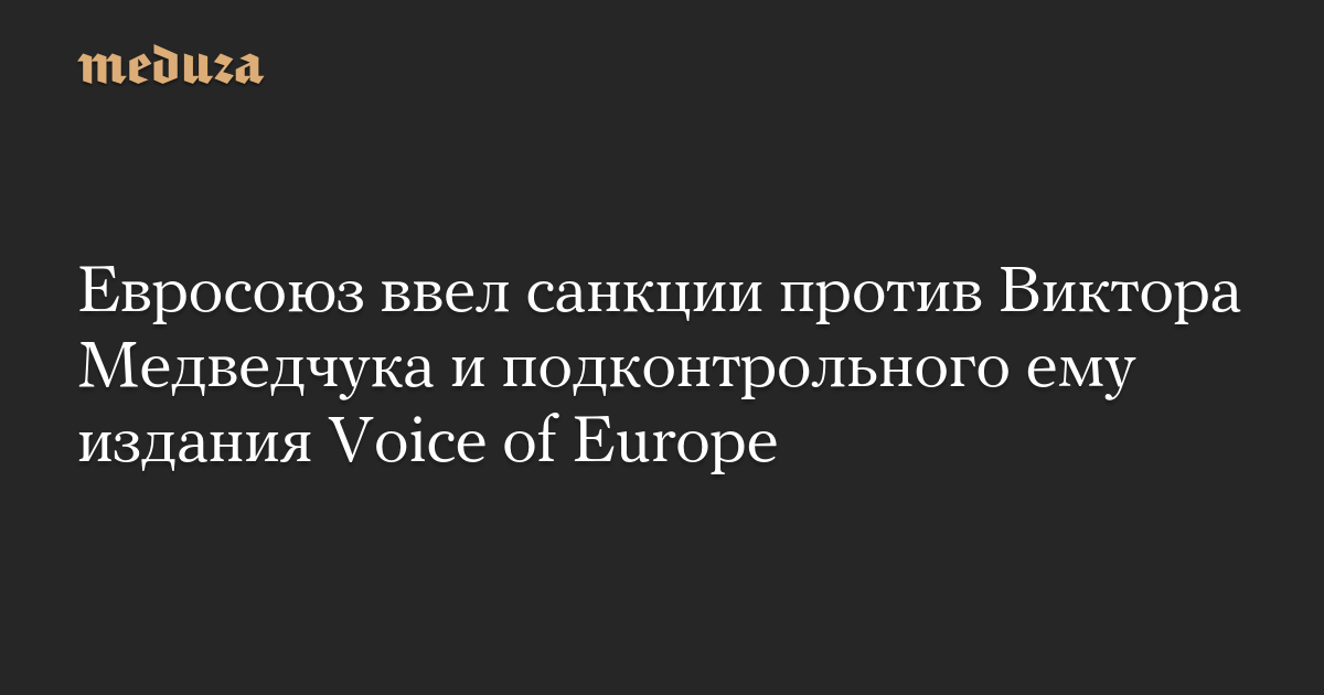 Европейский союз ввел санкции против украинского политика Виктора Медведчука, его приближенного Артема Марчевского и новостного издания Voice of Europe, говорится в пресс-релизе Совета ЕС.