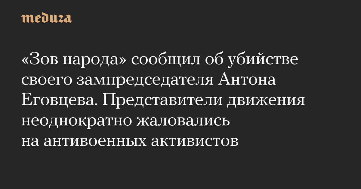 «Зов народа» сообщил об убийстве своего зампредседателя Антона Еговцева. Представители движения неоднократно жаловались на антивоенных активистов