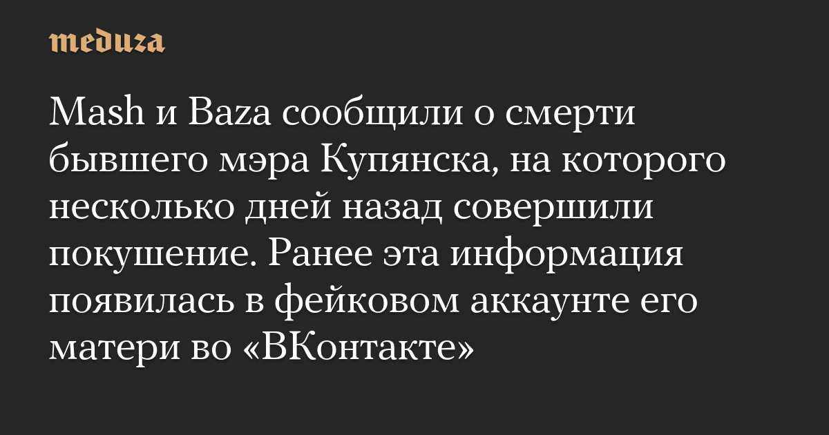 Mash и Baza сообщили о смерти бывшего мэра Купянска, на которого несколько дней назад совершили покушение. Ранее эта информация появилась в фейковом аккаунте его матери во «ВКонтакте»