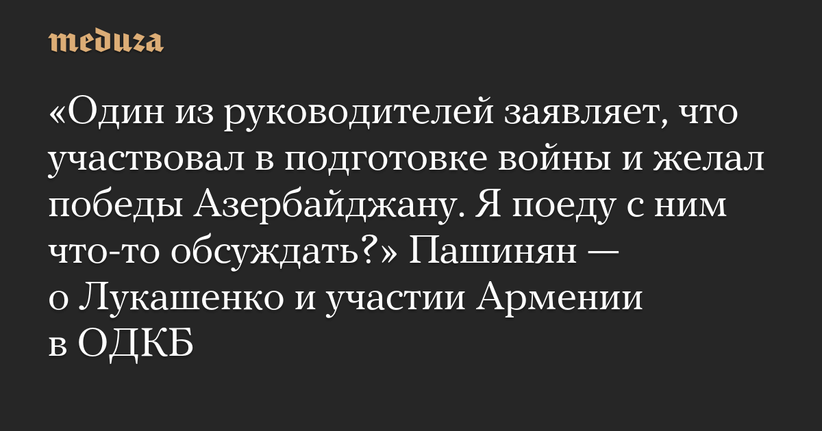 «Один из руководителей стран ОДКБ заявляет, что участвовал в подготовке войны, поощрял, верил и желал победы Азербайджану. И после этого я поеду с главой Белоруссии в формате ОДКБ что-то обсуждать?» — сказал Пашинян на заседании парламента.