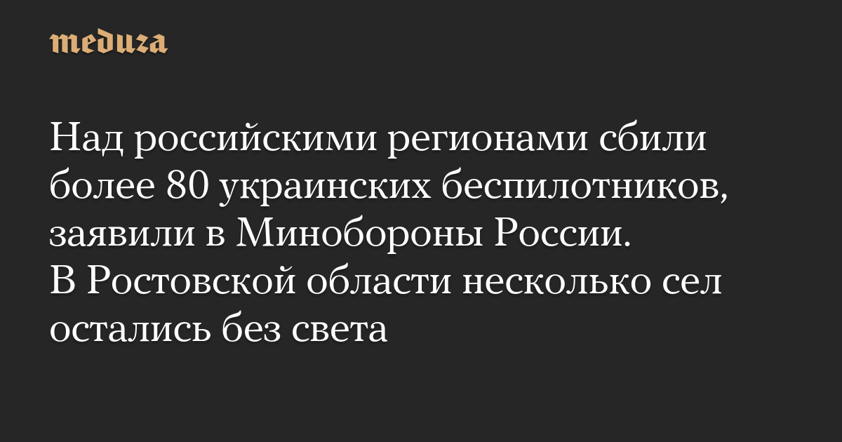 Над российскими регионами сбили более 80 украинских беспилотников, заявили в Минобороны России. В Ростовской области несколько сел остались без света