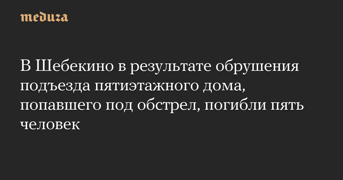 В результате обрушения подъезда пятиэтажного жилого дома в Шебекино, попавшего под обстрел ВСУ днем 14 июня, погибли пять человек. Об этом сообщил губернатор Белгородской области Вячеслав Гладков.