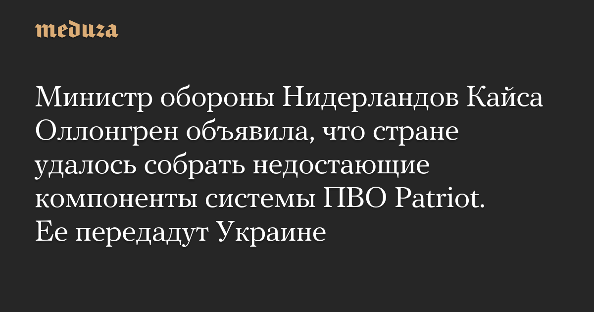 Министр обороны Нидерландов Кайса Оллонгрен объявила, что стране удалось собрать недостающие компоненты системы ПВО Patriot. Ее передадут Украине