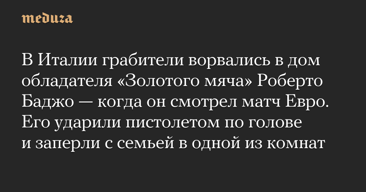 В Италии грабители ворвались в дом обладателя «Золотого мяча» Роберто Баджо — когда он смотрел матч Евро. Его ударили пистолетом по голове и заперли с семьей в одной из комнат