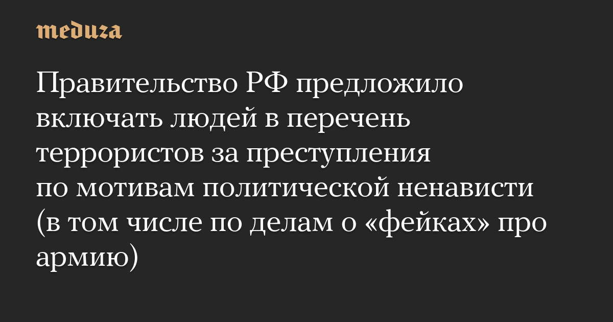 Правительство РФ предложило включать людей в перечень террористов за преступления по мотивам политической ненависти (в том числе по делам о «фейках» про армию)