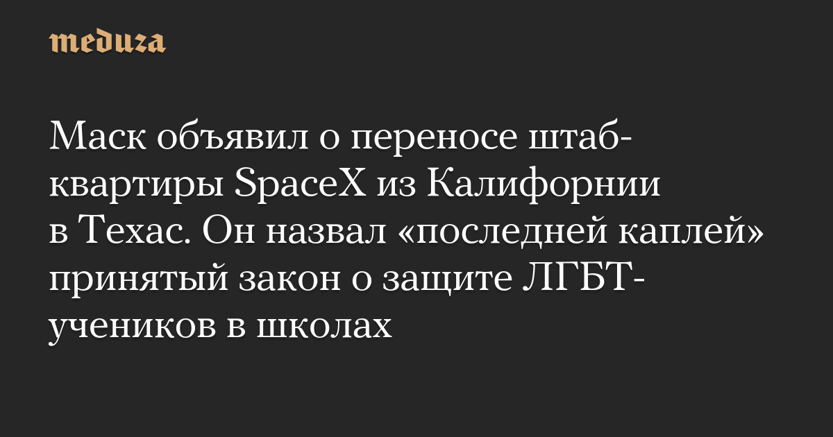 Маск объявил о переносе штаб-квартиры SpaceX из Калифорнии в Техас. Он назвал «последней каплей» принятый закон о защите ЛГБТ-учеников в школах