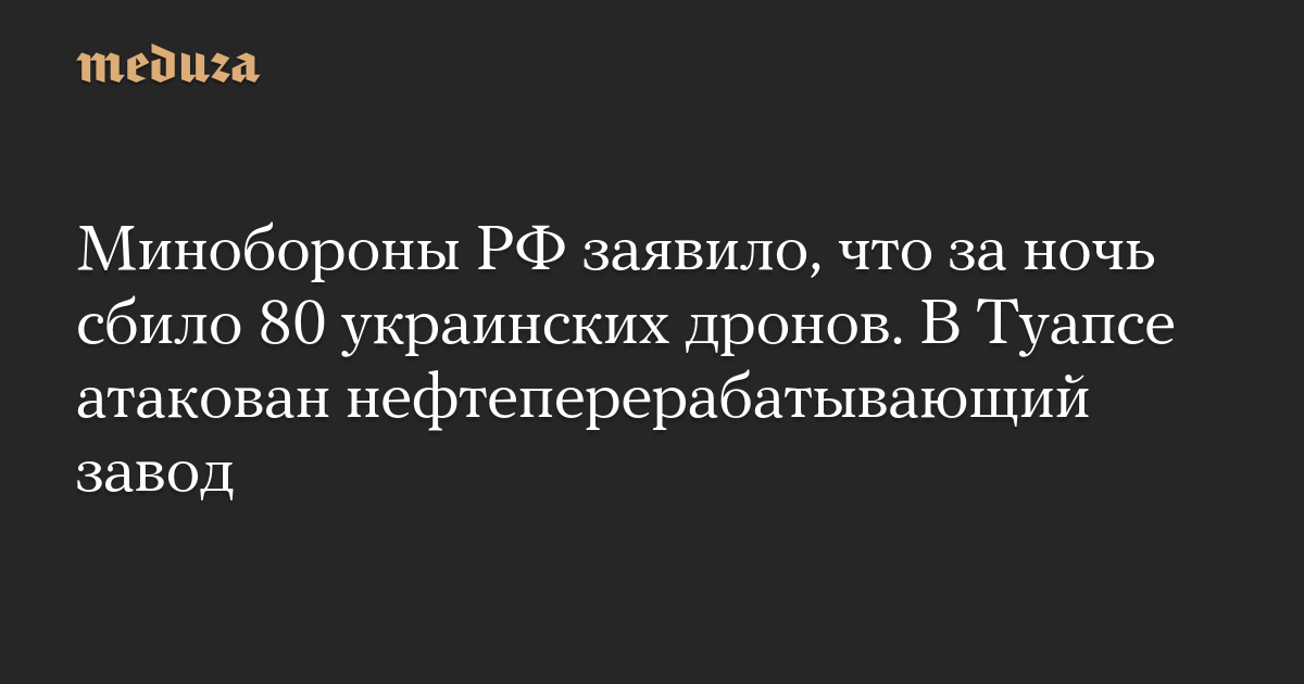 Минобороны РФ заявило, что за ночь сбило 80 украинских дронов. В Туапсе атакован нефтеперерабатывающий завод
