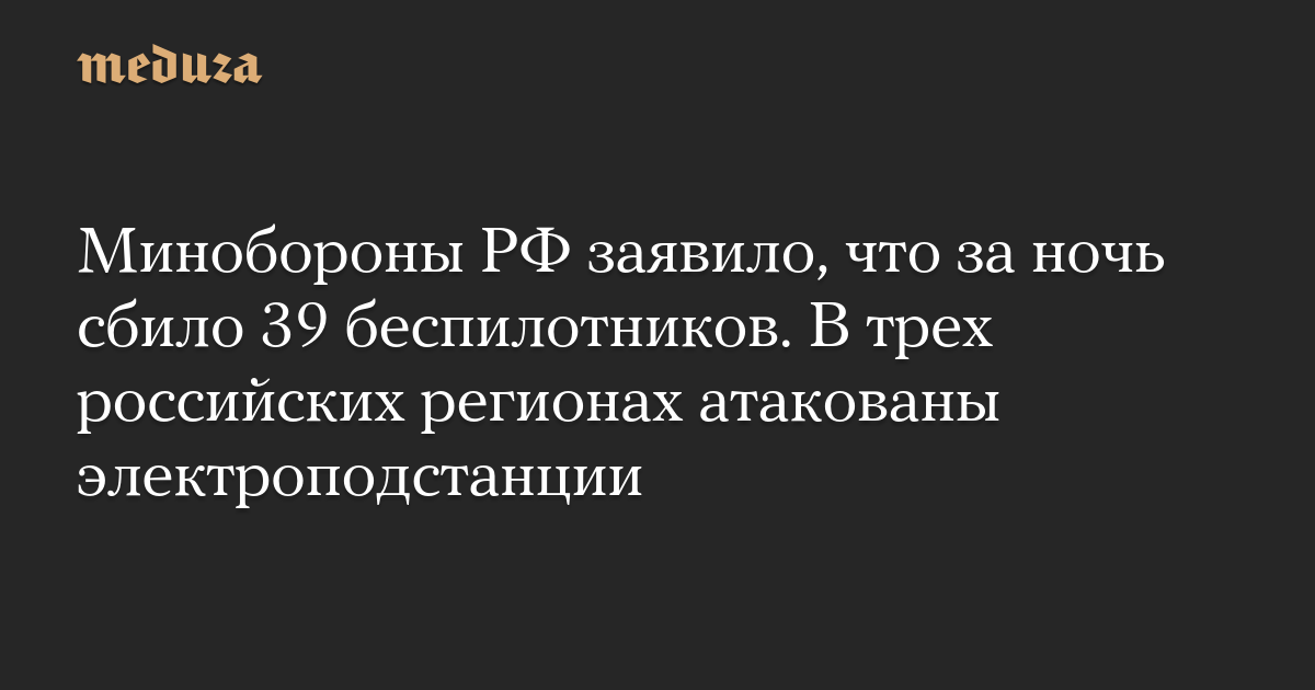Минобороны РФ заявило, что за ночь сбило 39 беспилотников. В трех российских регионах атакованы электроподстанции
