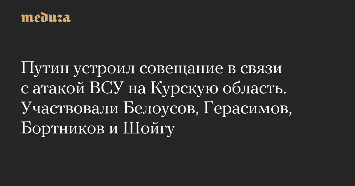 Владимир Путин собрал совещание «по ситуации в Курской области» с участием министра обороны Андрея Белоусова, главы Генштаба Валерия Герасимова, директора ФСБ Александра Бортникова и секретаря Совета безопасности Сергея Шойгу.