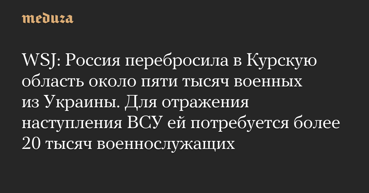 WSJ: Россия перебросила в Курскую область около пяти тысяч военных из Украины. Для отражения наступления ВСУ ей потребуется более 20 тысяч военнослужащих