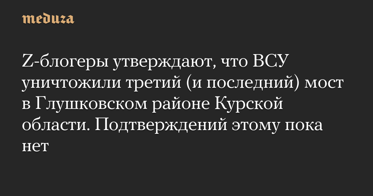 Z-блогеры утверждают, что ВСУ уничтожили третий (и последний) мост в Глушковском районе Курской области. Подтверждений этому пока нет