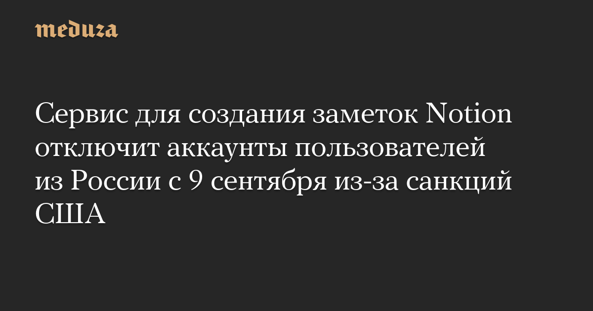 «Правительство США ввело ограничения, запрещающие доступ к определенным программным продуктам и сервисам любому лицу в России. В связи с этими ограничениями 9 сентября 2024 года Notion больше не будет предоставлять пользователям, находящимся в России, доступ к платформе», — цитирует ТАСС сообщение на сайте Notion.