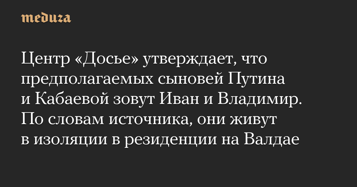 Центр «Досье» утверждает, что предполагаемых сыновей Путина и Кабаевой зовут Иван и Владимир. По словам источника, они живут в изоляции в резиденции на Валдае