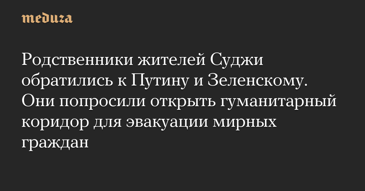 Родственники жителей города Суджа и Суджанского района Курской области написали письмо, в котором обратились к президенту России Владимиру Путину и президенту Украины Владимиру Зеленскому, а также омбудсменам двух стран — Татьяне Москальковой и Дмитрию Лубенцу. Они попросили организовать гуманитарный коридор для вывоза мирного населения из Суджанского района и начать переговоры об эвакуации людей. Письмо опубликовала «Новая газета».