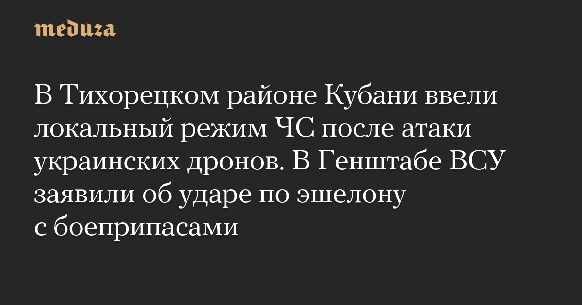 В Тихорецком районе Кубани ввели локальный режим ЧС после атаки украинских дронов. В Генштабе ВСУ заявили об ударе по эшелону с боеприпасами