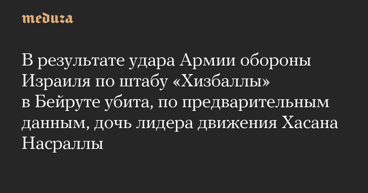 В результате удара Армии обороны Израиля по штабу «Хизбаллы» в Бейруте убита, по предварительным данным, дочь лидера движения Хасана Насраллы
