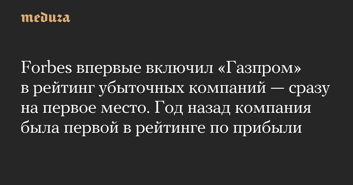 Forbes впервые включил «Газпром» в рейтинг убыточных компаний — сразу на первое место. Год назад компания была первой в рейтинге по прибыли