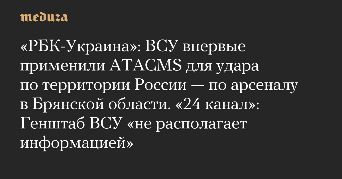 «РБК-Украина»: ВСУ впервые применили ATACMS для удара по территории России — по арсеналу в Брянской области. «24 канал»: Генштаб ВСУ «не располагает информацией»