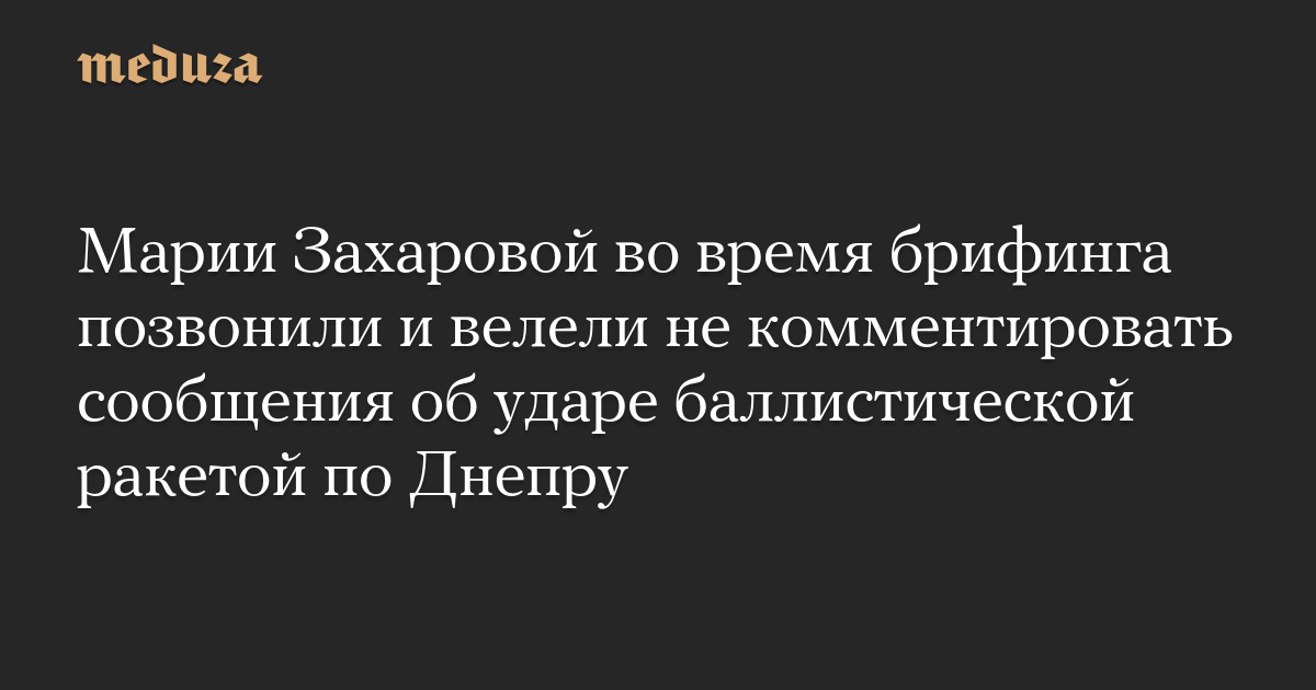 Официальному представителю МИД РФ Марии Захаровой во время брифинга с журналистами позвонили и запретили комментировать сообщения об ударе российской баллистической ракеты по Днепру.