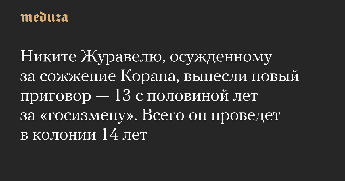 Никите Журавелю, осужденному за сожжение Корана, вынесли новый приговор — 13 с половиной лет за «госизмену». Всего он проведет в колонии 14 лет