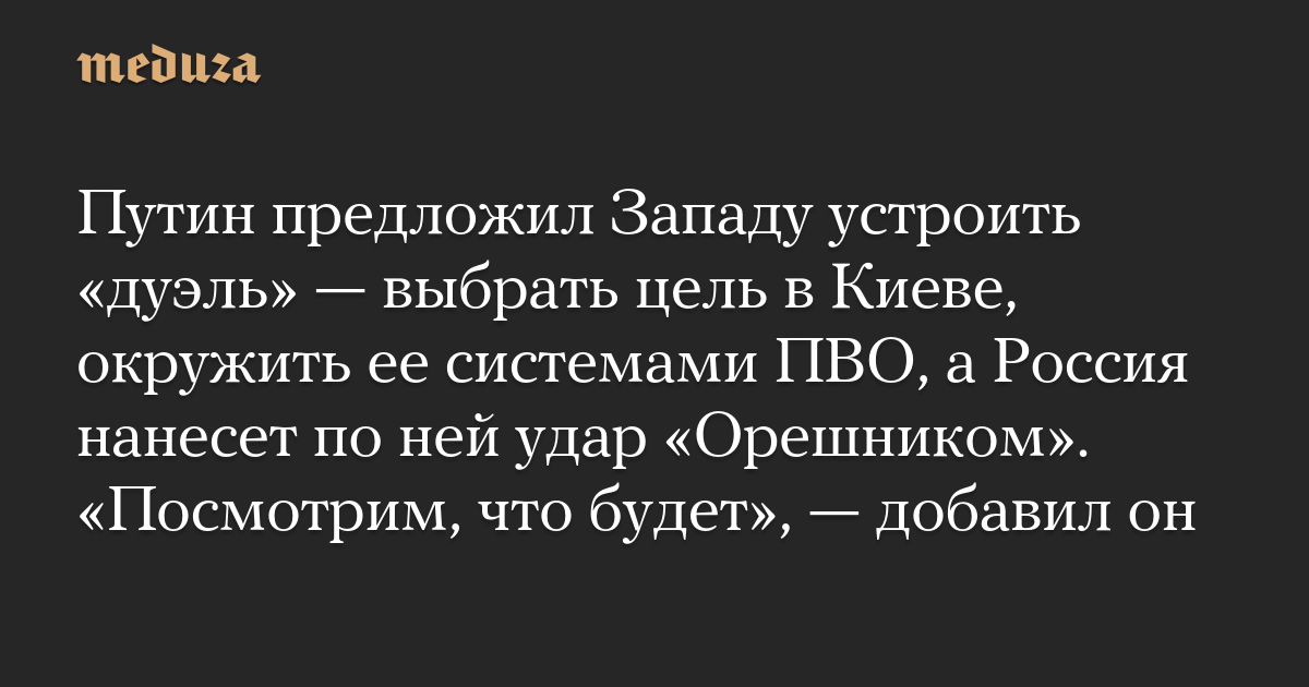 Путин предложил Западу устроить «дуэль» — выбрать цель в Киеве, окружить ее системами ПВО, а Россия нанесет по ней удар «Орешником». «Посмотрим, что будет», — добавил он