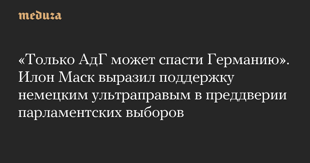 «Только АдГ может спасти Германию», — написал Маск в принадлежащей ему соцсети икс. На твит ответила кандидат в канцлеры от «Альтернативы» Алиса Вейдель, заявив, что Маск «совершенно прав» в своих суждениях.