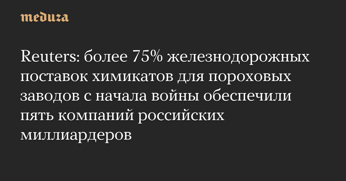 Reuters: более 75% железнодорожных поставок химикатов для пороховых заводов с начала войны обеспечили пять компаний российских миллиардеров