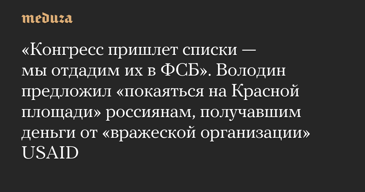 «Конгресс пришлет списки — мы отдадим их в ФСБ». Володин предложил «покаяться на Красной площади» россиянам, получавшим деньги от «вражеской организации» USAID
