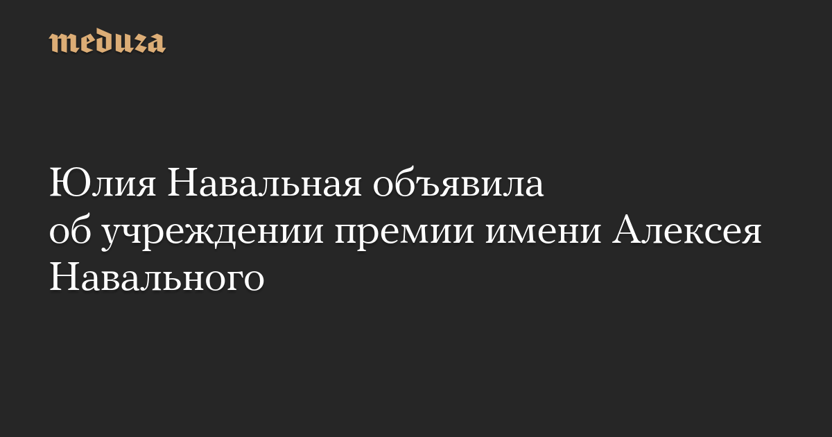 Юлия Навальная учредила премию имени своего покойного мужа. Награду будут вручать ежегодно 4 июня — в день рождения Алексея Навального, сообщила вдова политика 16 февраля на вечере его памяти в мемориальной церкви кайзера Вильгельма в Берлине.